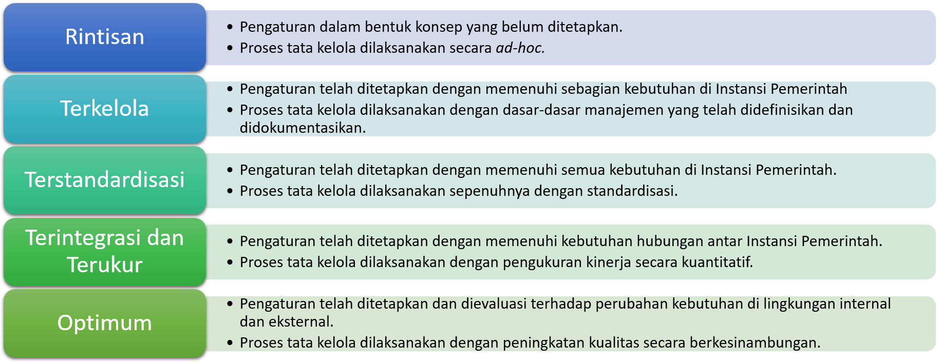 Tingkat kematangan pada kapabilitas proses diterapkan pada domain tata kelola SPBE dan domain kebijakan internal SPBE. Berikut adalah karakteristik tingkat kematangan pada kapabilitas proses.