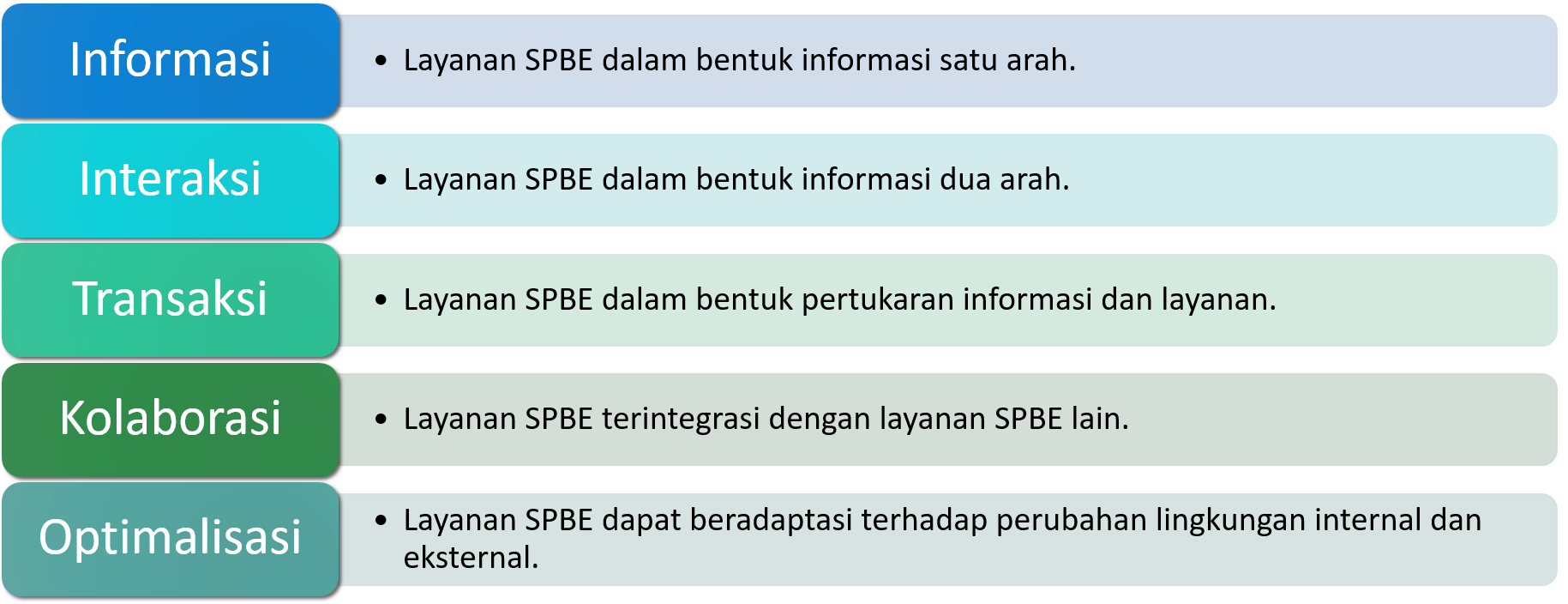 Tingkat kematangan pada kapabilitas fungsi SPBE diterapkan pada domain layanan SPBE. Berikut adalah karakteristik tingkat kematangan pada kapabilitas Fungsi: